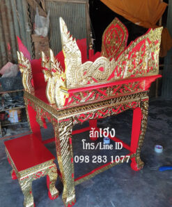 โต๊ะหมู่บูชา ไม้สักปิดทอง แกะสลักลายดอกไม้ ลายดอกพิกุล ลายหลวง ปิดทองร่องสีแดง ร่องกระจก คัดไม้สักที่มีอายุ 30 ปีขึ้นไป เพื่อมาทำโต๊ะหมู่บูชา