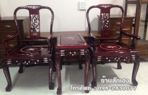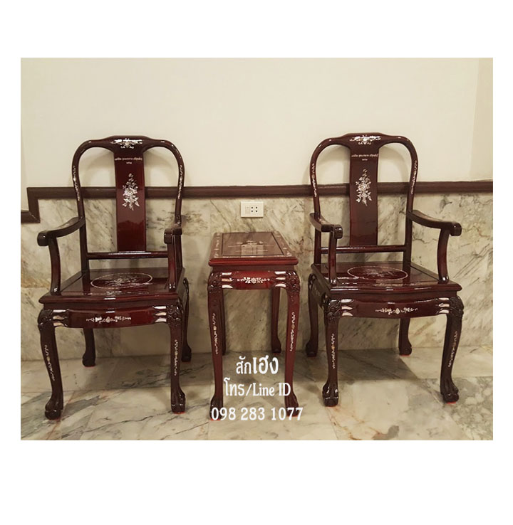 ชุดรับแขกฝังมุก 3 ชิ้น ฝังมุก ประกอบด้วย เก้าอี้ฝังมุก เท้าแขนขาสิงห์ 2 ตัว โต๊ะเคียงฝังมุก 1 ตัว เข้าชุดสำหรับรับแขก