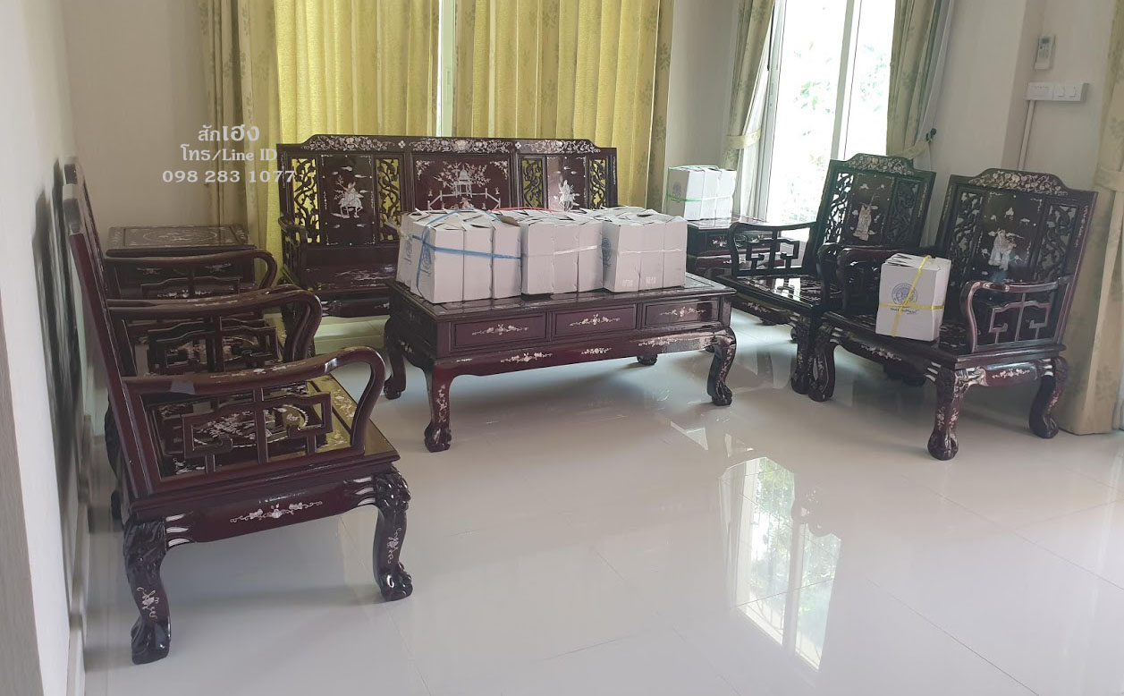 ชุดรับแขกฝังมุก 8 ชิ้น ประกอบด้วย โซฟายาวฝังมุก 1 ตัว ,โต๊ะเคียงยาวฝังมุกพร้อมลิ้นชัก 3 ช่อง 1 ตัว, เก้าอี้เท้าแขน ฝังมุก 4 ตัว, โต๊ะเคียงเล็กฝังมุก 2 ชิ้นพร้อมลิ้นชัก